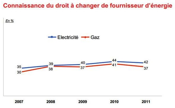Selon le baromètre 2011 du médiateur national de l’énergie, cinq ans après l’ouverture à la concurrence, seulement 42% de Français disent savoir qu’ils peuvent changer de fournisseur d’électricité, et seulement 37% pour le gaz naturel.