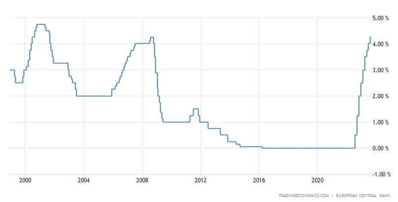 Si l’on observe la courbe des taux d’intérêts en Europe sur les 20 dernières années, on constate rapidement que les taux sont quasiment au plus haut niveau.